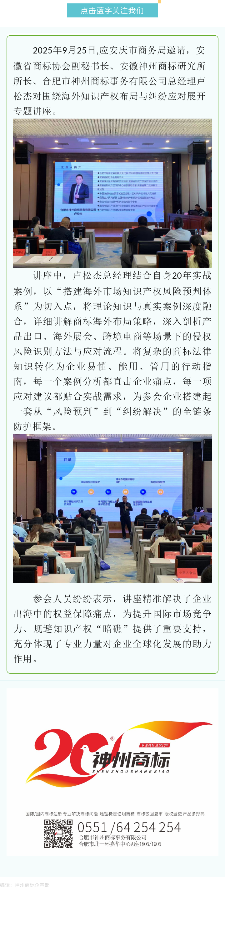 我司卢松杰总经理受邀安庆市商务局围绕海外知识产权布局与纠纷应对展开专题讲座